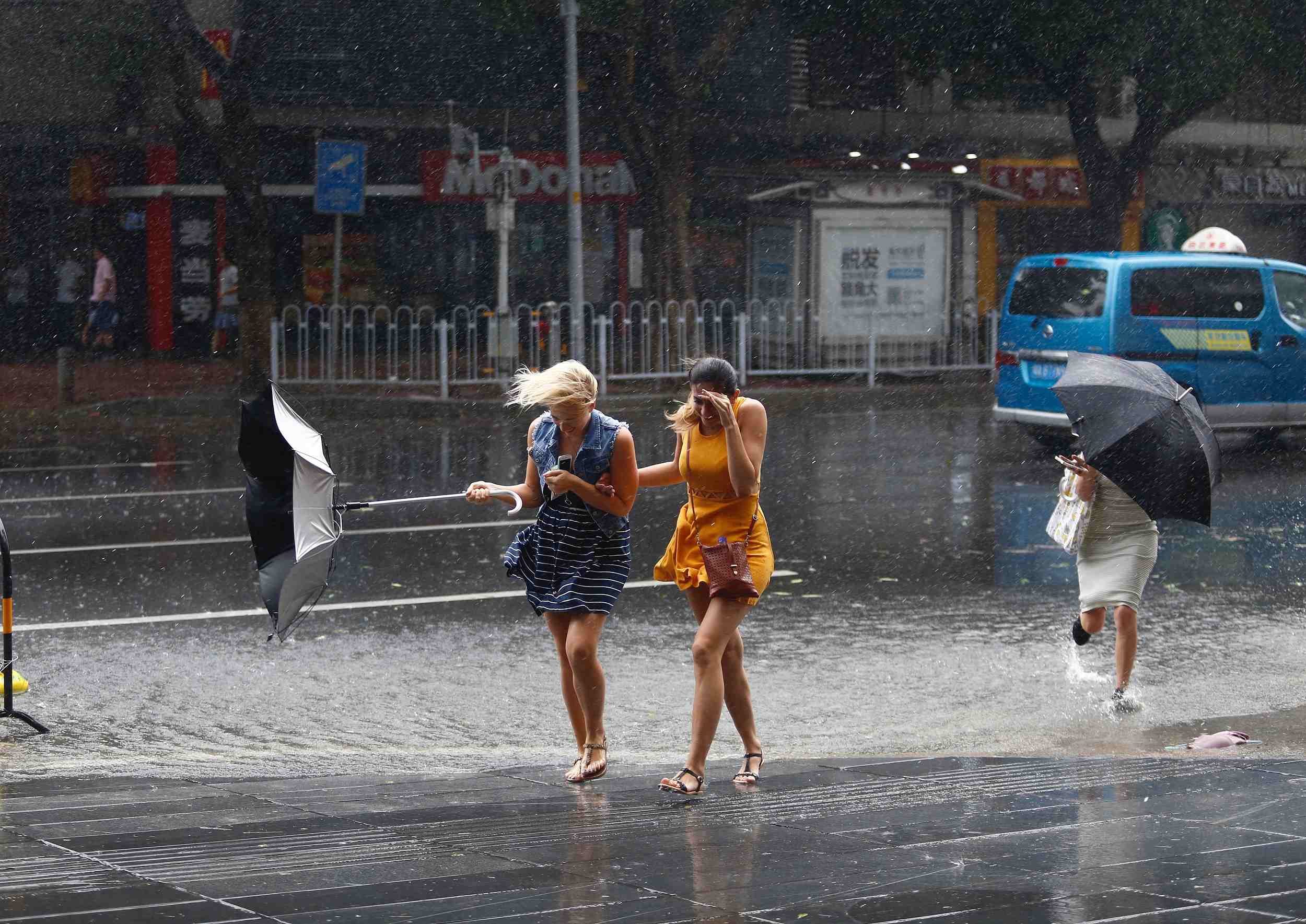 深圳南山区科技园,行人在风雨中前行。