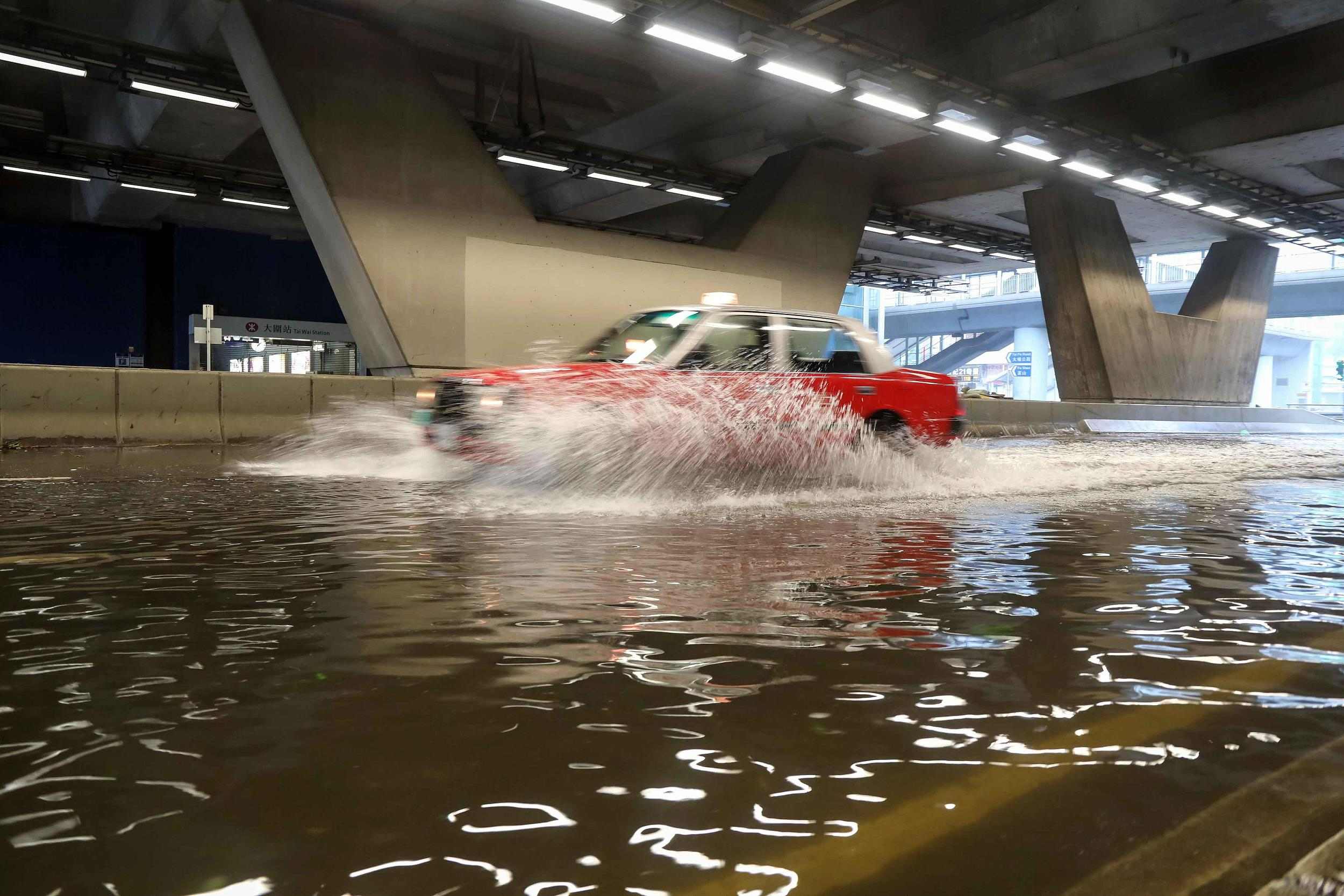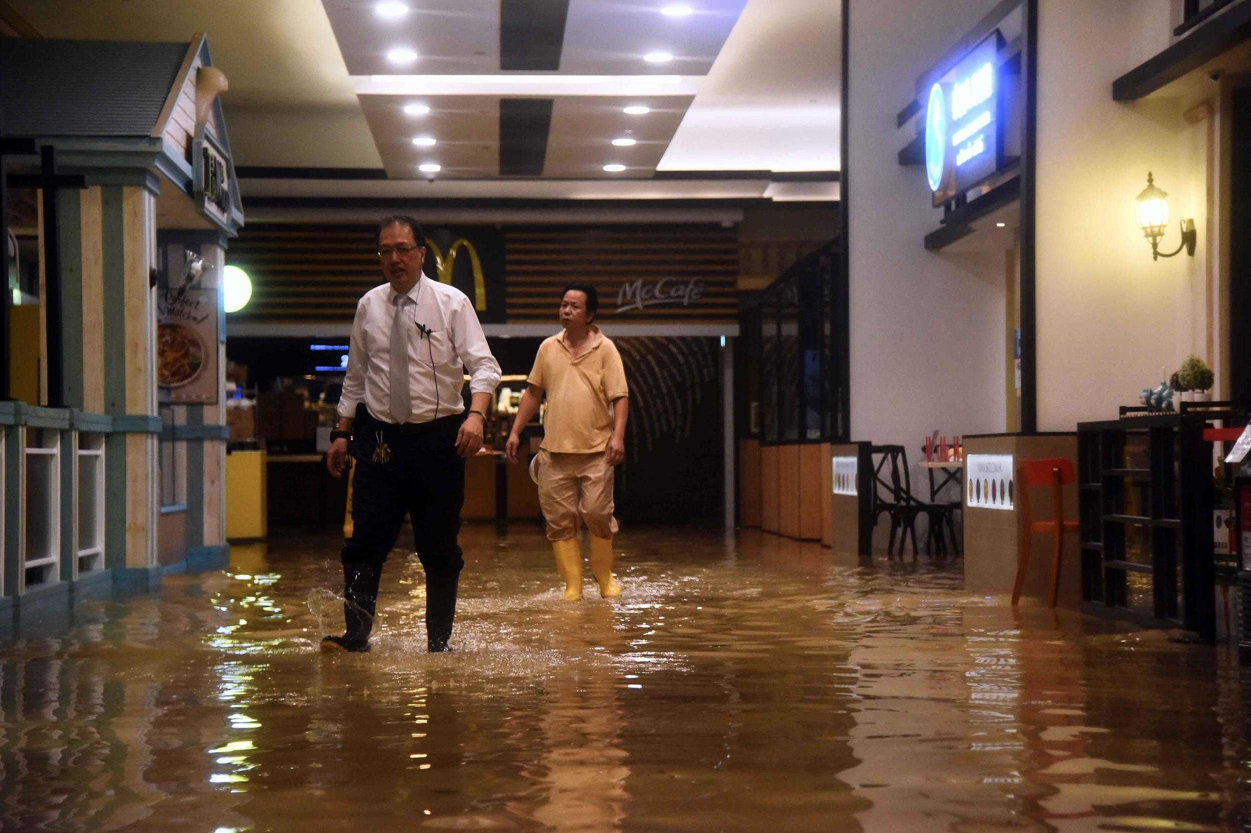2018年9月16日,强台风“山竹”逼近,香港天文台悬挂10号风球及红色暴雨警告信号。在杏花邨,海水淹没街道及附近的商场。