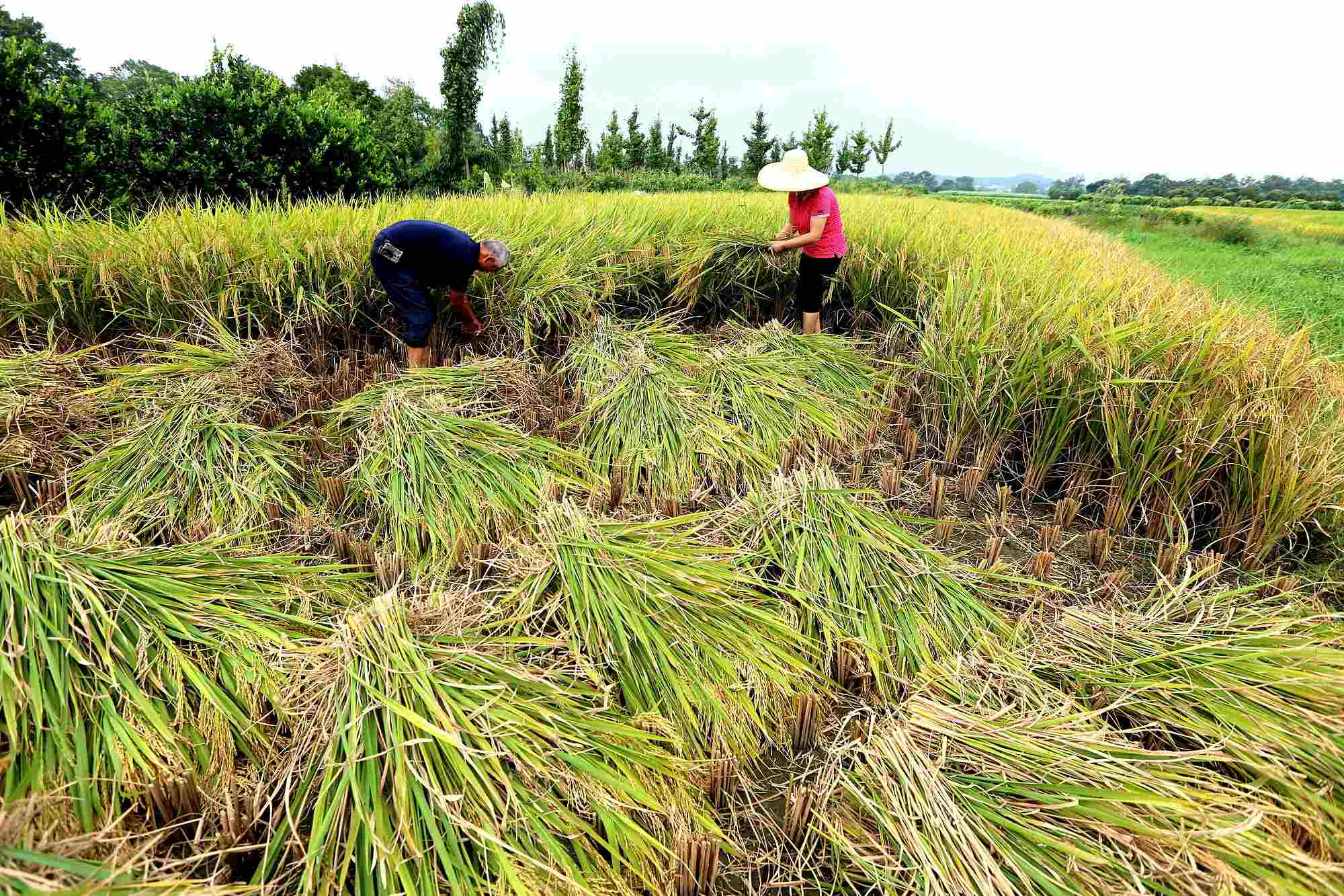 2018年9月16日,桂林,全州县绍水镇塘口村村民在台风“山竹”到来前抢收水稻。
