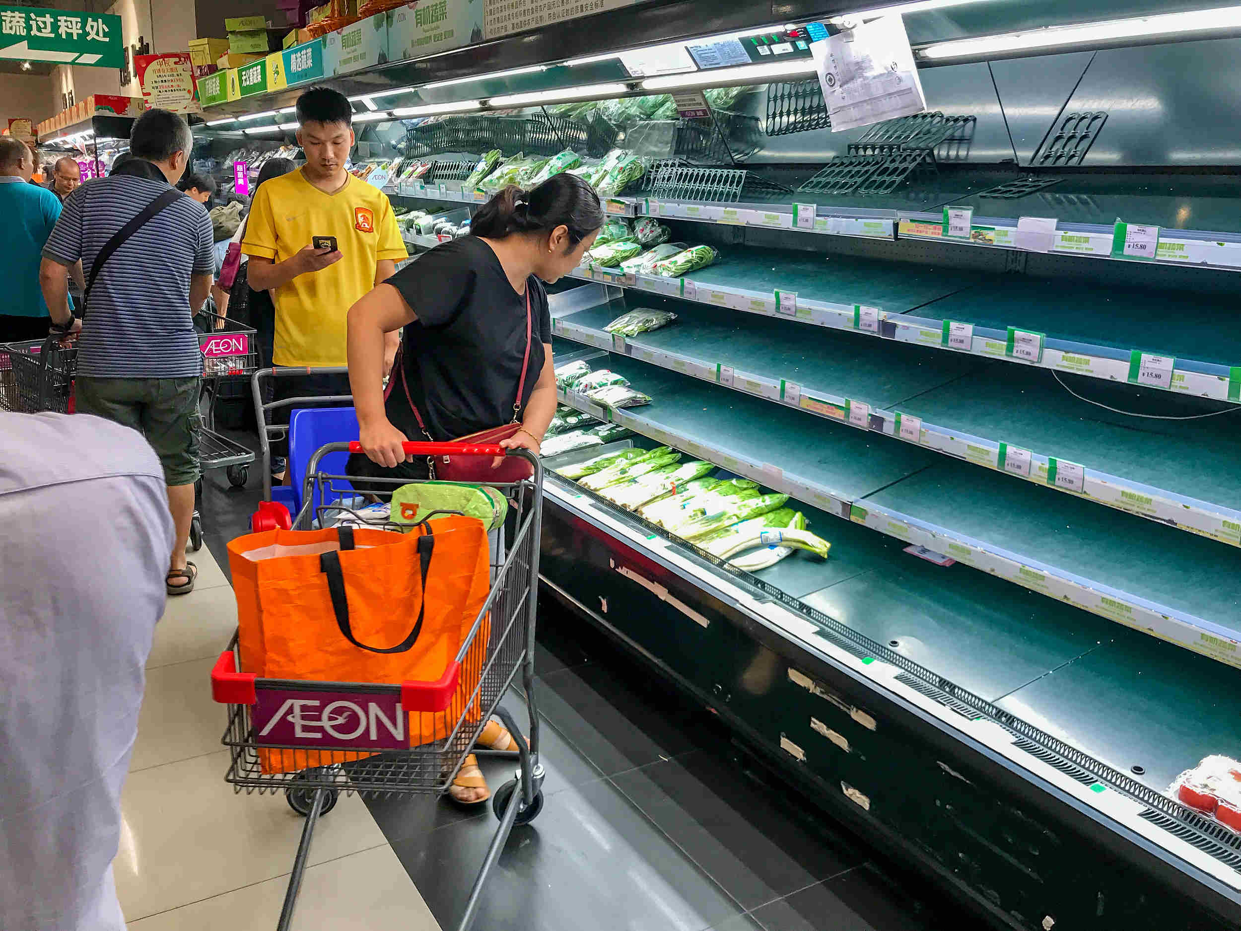 “山竹”来袭前一日,9月15日,广州部分超市蔬菜、冰鲜肉被抢购一空。