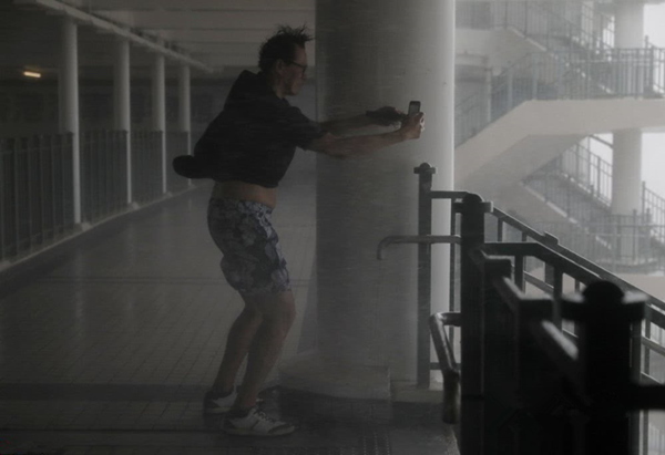 男子拿着手机拍恶劣天气,自己衣服都被吹起来,感觉要被吹走了。