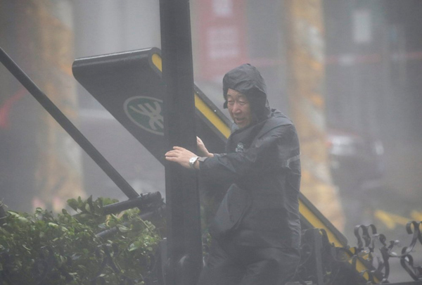 目前,广东全省各部门正严阵以待,广东省三防总指挥部昨晚18点将防风应急响应由Ⅱ级提高到Ⅰ级。图为9月16日,广东深圳,在倒塌的地铁站牌旁,一名男子紧抱电线杆。