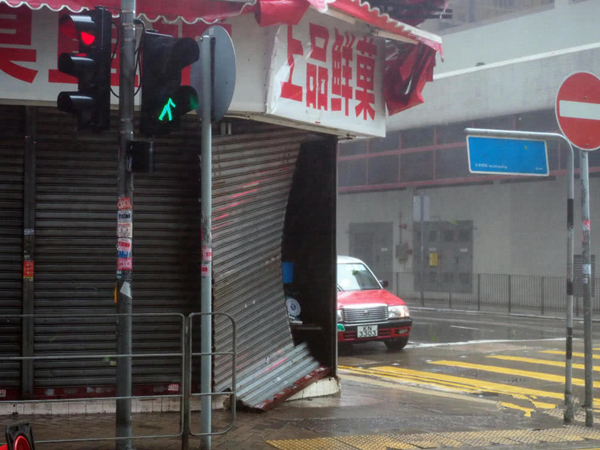 图为香港一家店铺的铁闸门被强风吹开。