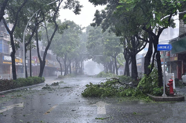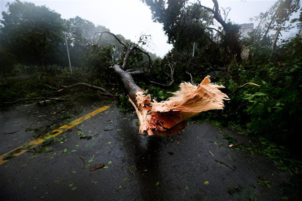 9月16日,珠海市区的街道上,风吹断的树枝散落一地。