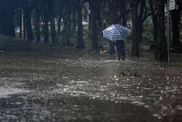 9月16日,在深圳市福田区,行人在积水的路面行走。新华社记者 毛思倩 摄
