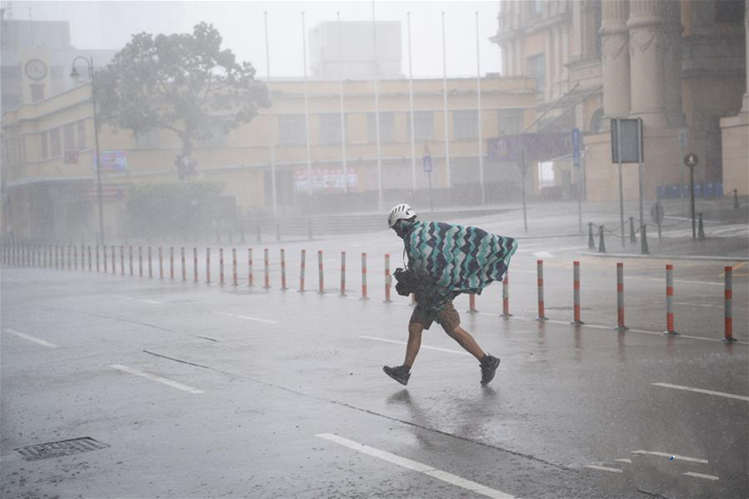 2018年9月16日,受超强台风“山竹”影响,广州市大风大雨,在新港西路附近,市民迎风艰难出行。