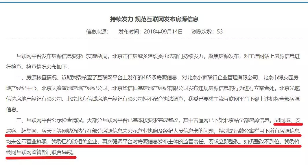 9 月 14 日,北京市住建委通报互联网平台房源信息公示检查情况,大部分互联网平台已基本按要求完成整改,而 58 同城、安居客、赶集网、房天下等网站仍存在部分房源信息未公示营业执照及经纪人员信息卡的问题。住建委表示,如仍整改不到位,将会同互联网监管部门联合惩戒。