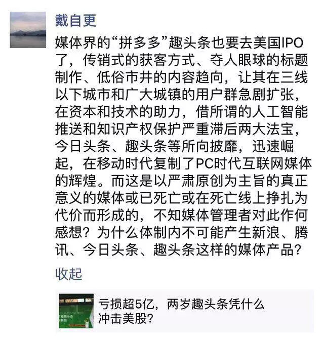 前新京报社社长、现北京市文化投资发展集团总经理戴自更针对此事表达了自己的看法。其在朋友圈称,趣头条和今日头条类似,都是借所谓的人工智能推送和知识产权保护严重滞后两大法宝崛起。