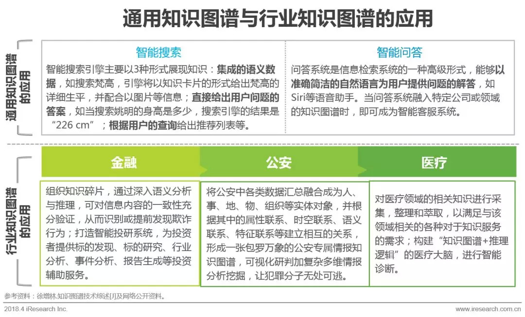 从覆盖范围的角度来说,知识图谱可分为应用相对广泛的通用知识图谱和专属于某个特定领域的行业知识图谱。通用知识图谱注重横向广度,强调融合更多的实体,主要应用于智能搜索、智能问答等领域。行业知识图谱注重纵向深度,需要考虑到不同的业务场景与使用人员,通常需要依靠特定行业(如金融、公安、医疗、电商等)的数据来构建,实体的属性与数据模式往往比较丰富。