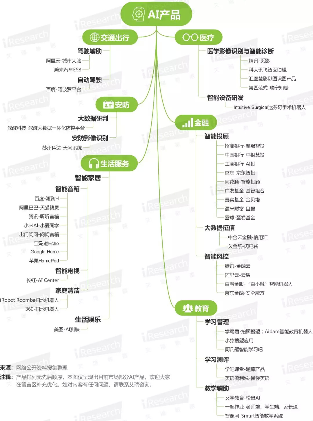 以下为艾瑞对金融、安防、医疗、教育、交通、生活服务6个热门场景的AI产品盘点: