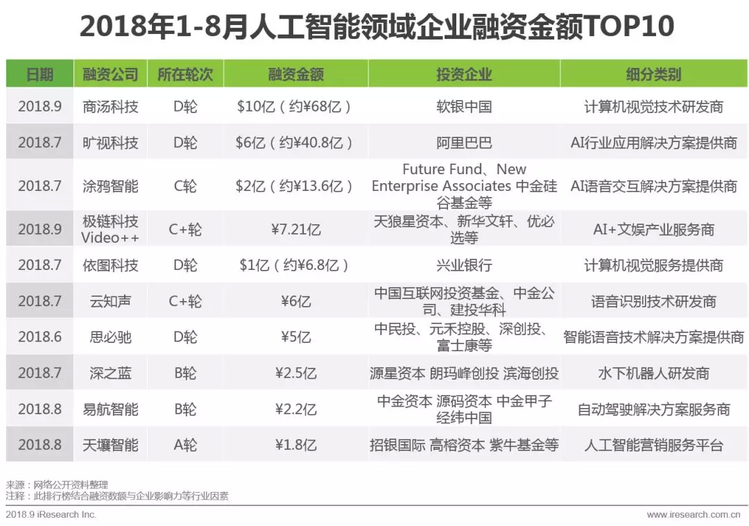 2018年上半年人工智能领域投资“钱景”盘点: