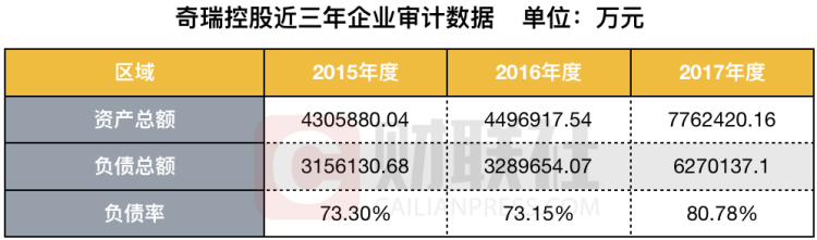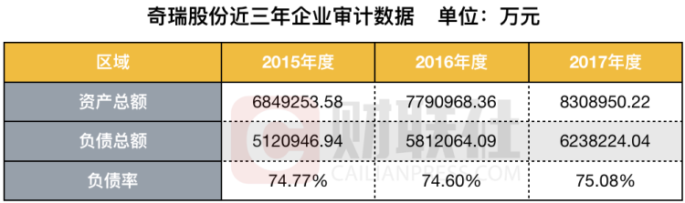 奇瑞控股的增资扩股预公告提供的数据表明,其2015、2016、2017年年度负债率分别为73.3%、73.15%和80.78%;而奇瑞股份这三年的负债率为74.77%、74.6%和75.08%,资产负债率均居高不下。