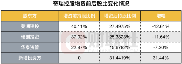 而奇瑞控股增资扩股的方案为募集83.32亿元资金,企业注册资本增至624,055.8251万元。其中,芜湖建投持股比例27.4975%、瑞创投资持股比例25.3823%、华泰资管持股比例15.6782%、新增投资方持股比例31.4419%。
