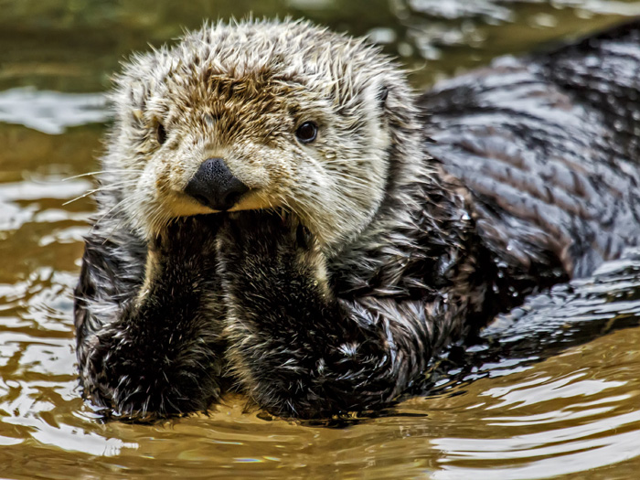 3月18日,美国,一只小水獭悠闲地趴在水面上。68岁的摄影师莎伦·兰迪斯拍摄到小水獭捂嘴“卖萌”的样子。