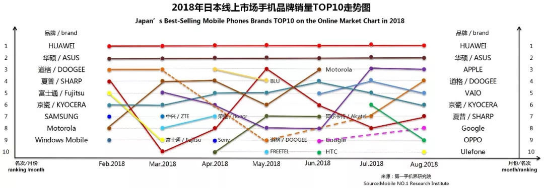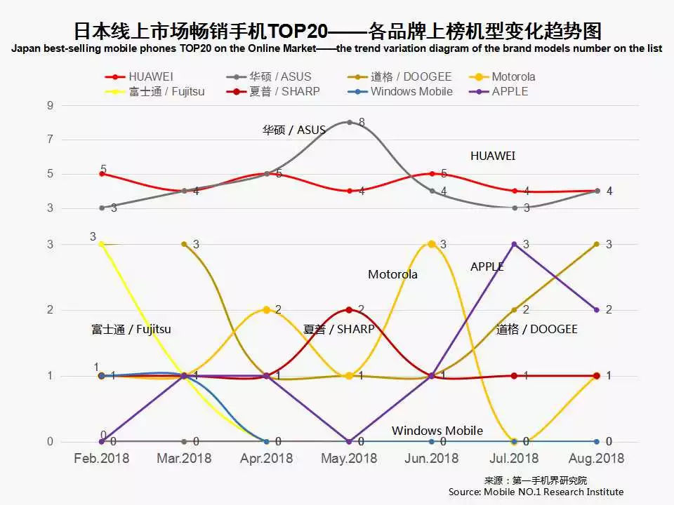 8月日本线上市场畅销手机主要分布为:华为4款、华硕4款、道格3款、苹果2款;夏普、Google、摩托罗拉、OPPO、Ulefone、VAIO、京瓷各1款。