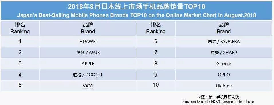 华为、华硕、苹果、道格、VAIO成为8月日本线上市场手机品牌销量TOP 5。