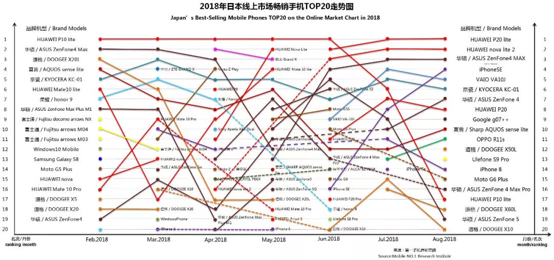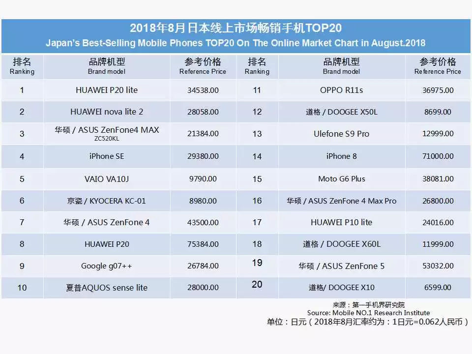 华为 P20 lite、华为 nova lite 2、华硕 ZenFone4 MAX ZC520KL、iPhone SE、VAIO VA10J、京瓷 KC-01、华硕 ZenFone 4、华为 P20、Google g07++、夏普 sense lite成为8月日本线上市场畅销手机TOP 10。