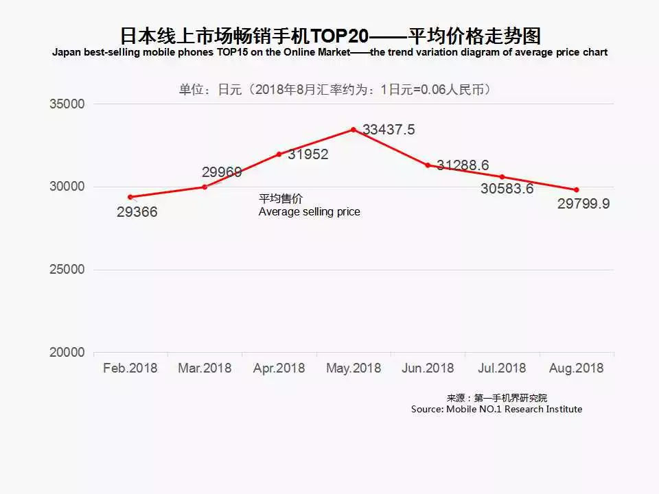 2018年8月日本线上市场畅销手机20款机型平均价格为29799.9日元(约1788元人民币),环比下滑2.6%。