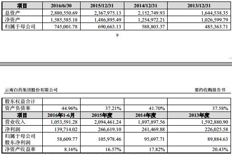 截至2016年6月30日,白药控股合并口径下的总资产约为288.06亿元,净资产为158.56亿元,资产负债率为44.96%;2013年至2015年,白药控股分别实现收入159.29亿元、189.79亿元、209.45亿元,归母净利润分别为8.99亿元、9.57亿元、10.60亿元。