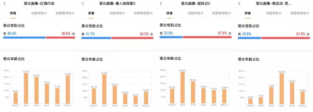 同为热门档期,增速差异如此明显,除了节日氛围等因素加成外,影片种类的多元性对于不同人群观影需求的调动,也是重要原因。按照淘票票专业版提供的用户画像来看,春节档票房排名前四的《红海行动》《唐人街探案2》《捉妖记2》《熊出没·变形记》,分别是男性及大龄观众偏爱的影片、男女比例较为均衡的影片、女性观众偏爱的影片、儿童偏爱的影片,几乎覆盖了所有的观影人群。