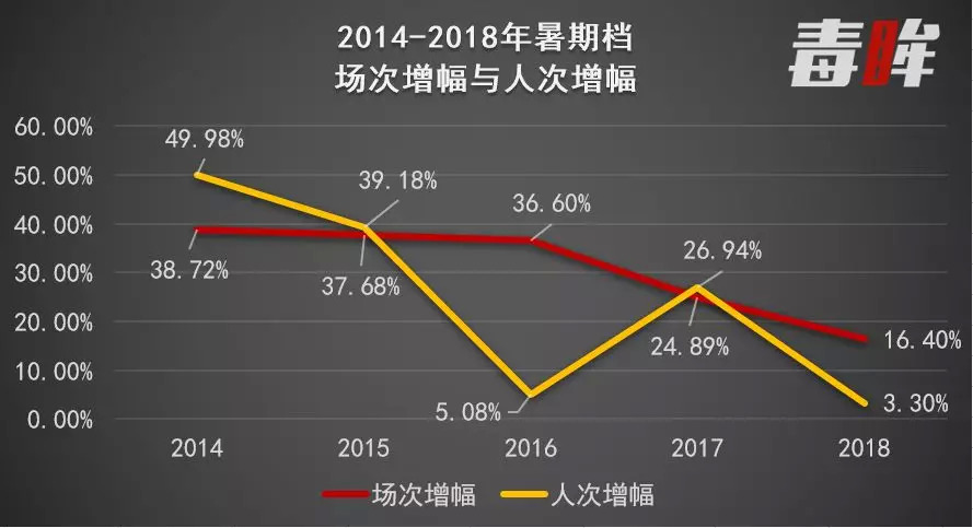数据显示,今年174亿的暑期档成绩,较去年仅上涨了6%;观影人次4.9亿次,也仅仅只上涨了3%;然而总放映场次却增长至2810万场,涨幅达16%。说明今年在放映场次更多、口碑佳片也不少的情况下,观众的观影热情并没有比去年更为高涨。