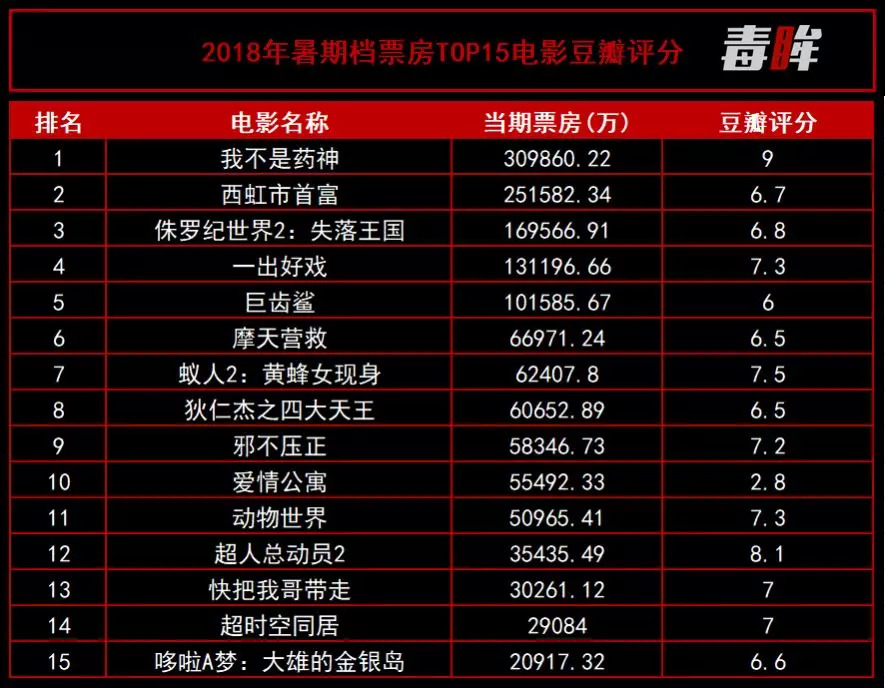 和2016年相比,今年暑期的情况截然不同:暑期票房前15的电影中,除《爱情公寓》,其余14部影片的豆瓣评分都在6分以上,其中还有8部影片超过了7分,《我不是药神》更是评分更是高达9分。此外,今年暑期的国产电影保护月似乎也消失了,《巨齿鲨》《摩天营救》等好莱坞大片同样在暑期登陆了院线。
