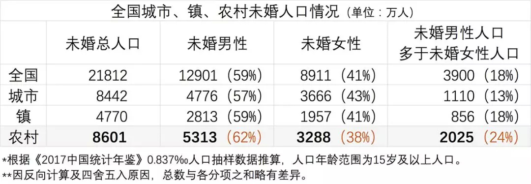 据《2017中国统计年鉴》推算,2016年我国有2.1亿多未婚人口,无论城市、镇、农村,未婚男性均远远高于未婚女性,性别失衡在农村地区尤为严重,未婚男性人口比未婚女性人口多出2025万,占农村地区未婚总人口的24%。
