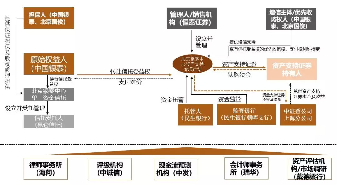 第三层:在专项计划设立之后,管理人(恒泰证券)根据专项计划文件的约定,在专项计划设立日向托管人(民生银行)发出付款指令,以向中国银泰收购其持有的全部银泰中心信托受益权;管理人恒泰证券(代表专项计划)在专项计划设立日便成为唯一信托受益人,从而间接享有对银泰置业的优先债权及次级债权。