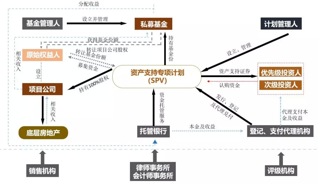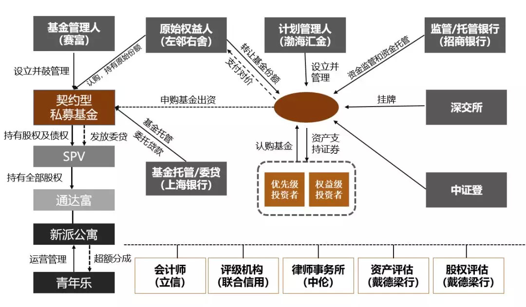 第一层:原始权益人即左邻右舍投资管理公司设立私募基金,由赛福设立并管理的私募基金持有项目公司的股权,同时由私募基金向项目公司或项目公司股东发放委托贷款,项目公司持有标的物业。