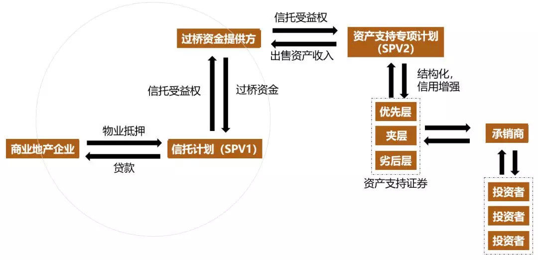 通过母公司或者其他过桥资金提供方形成信托计划向地产企业(借款人)发放信托贷款,地产企业获得资金并向信托计划抵押地产。过桥资金提供方则成为信托计划的受益人。CMBS的基础资产由此形成,也即基础资产为过桥资金方让与给SPV的信托收益权。资产支持专项计划通过支付对价给过桥资金方取得信托收益权,间接获取物业的未来收益。