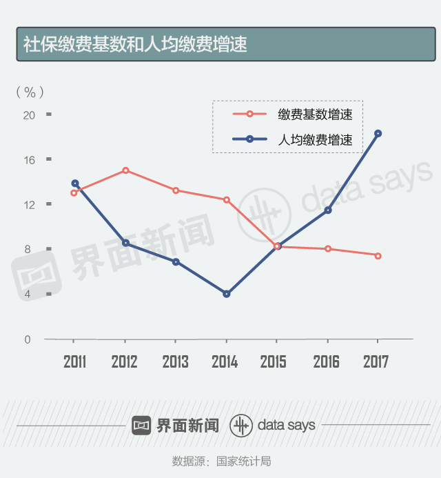 数据显示,社保缴费基数增速在过去几年间不断下滑,也就意味着社会平均工资涨得越来越慢,然而人均社保缴费增速出现了快速上涨——这说明个人的社保负担在加重。