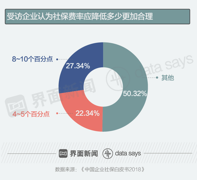 另外,根据《中国企业社保白皮书2018》的调研,27.34%的企业认为社保费率应该下降8-10个百分点,占比最高;22.34%的企业认为应该下降4-5个百分点,占比次高。