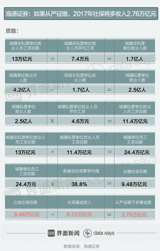 据海通证券研究所测算,如果2017年全国各地都由税务部门统一征收社保,那么2017年应缴社保总额应为9.48万亿元,比实际社保基金收入多出2.76万亿元。