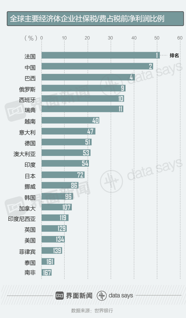 根据世界银行发布的2018年全球企业综合税/费率排行榜,中国企业以67.3%的综合税/费率在全球189个有数据经济体中排名第12位,其中社保税/费率排名第2位,仅次于法国。