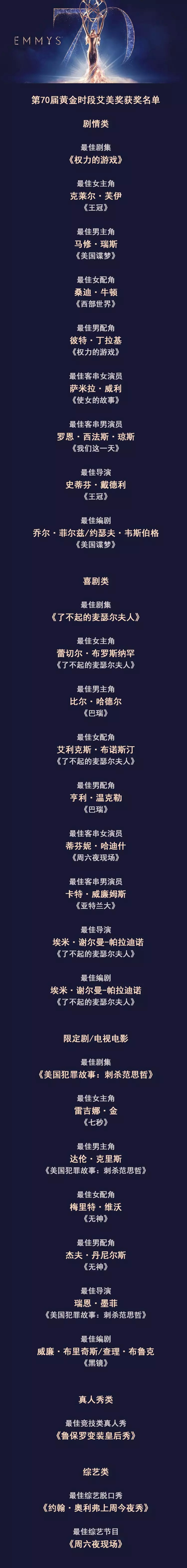 第70届黄金时段艾美奖颁奖礼今天上午在美国洛杉矶举行。