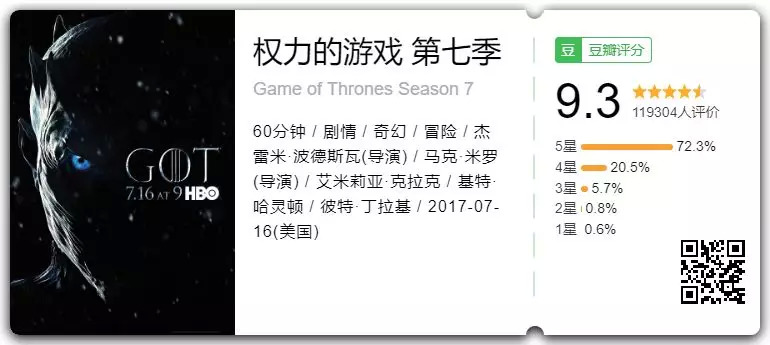 虽然少了原著加持的《权力的游戏》第七季在权迷心中评价一直不算高,在豆瓣的评分也是与第五季一样在该系列“垫底儿”,但人气不容置疑。
