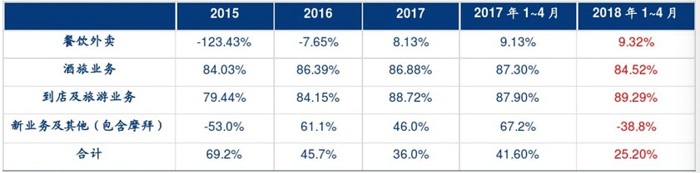 2017年,美团毛利122元,到店、酒店和旅游占据96亿元,今年前四个月,美团毛利40元,到店、酒店和旅游占据38亿元,毛利率维持在88%左右,而2017年餐饮外卖的毛利率则为8.1%。