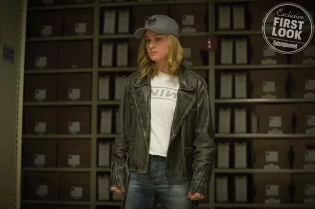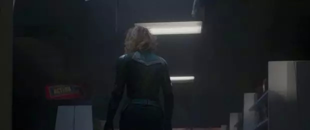 因此可以推断:这里的镜头想必是发生在尼克·弗瑞找到惊奇队长之后。再结合后面的预告内容和之前曝出的一张同款装扮剧照来看,女队大概是来神盾局的档案馆查阅有关自己身份的资料。