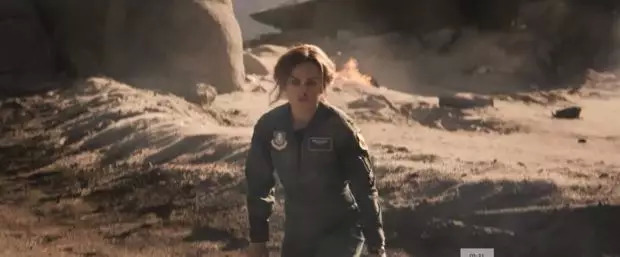 7、仔细观察最后两帧跌倒的画面,可以看到穿着空军制服的女队身在一个貌似外星球的地方(一般这种坑坑洼洼的地形多半不是地球),并且指尖的光波难道表示她已经具有了超能力?