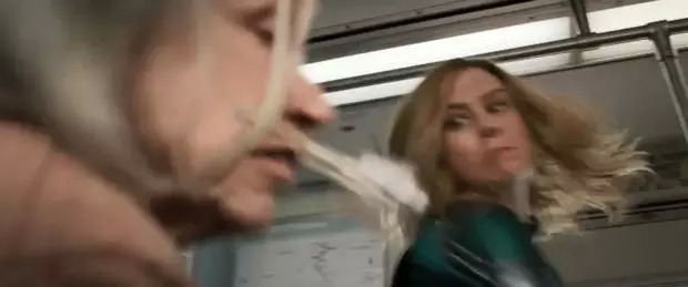 1、预告一开始,一个类似逃生舱的神秘物体从天而降,然后应该是舱体破裂,女队从里面掉出来,砸到了一家百事达音像店里。
