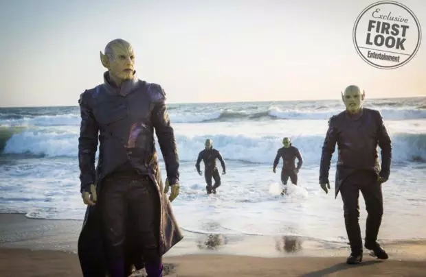 除了蓝皮肤的克里人,另一个外星种族是绿皮肤、尖耳朵、下巴比灭霸褶子还多的斯库鲁人(不是《龙珠》里的短笛/比克)。斯库鲁人可以随意改变外形,甚至可以复制对方的能力和记忆,所以也被称为“山寨星人”。