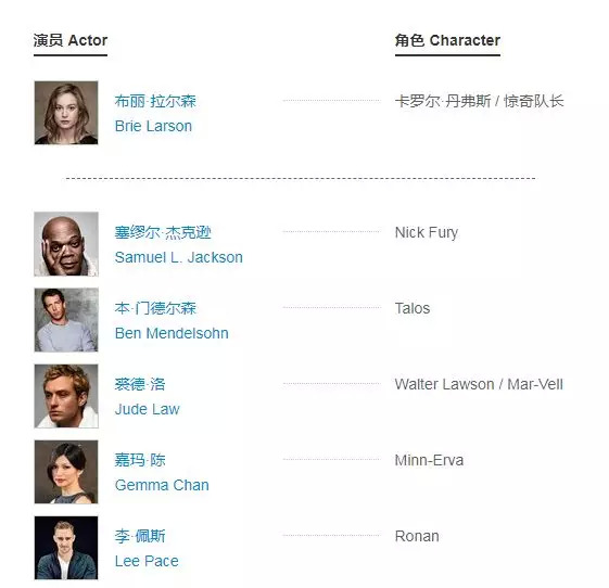 在《惊奇队长》中出现的外星入侵者主要有两个种族,一个是克里人,外貌特征是蓝皮肤,在本片中出现的克里人角色有李·佩斯饰演的指控者罗南,嘉玛·陈饰演的米涅瓦博士。