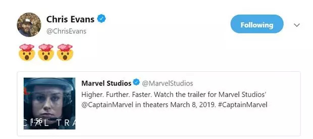 预告片曝光之后,克里斯·埃文斯立刻在推特进行了转发,并附了3个惊讶的emoji,不仅让人脑补出一只等待救兵支援的猕猴桃看着闪亮登场的女队从天而降,露出一脸“holy high”的表情。