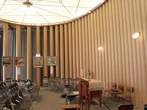 1995年阪神大地震后,一些前越南难民不能入住由日本政府提供的临时住房,坂茂就为他们建造了“纸筒木宅”。他还在短短五个星期内与160名志愿者一道建造了神户市鹰取“纸教堂”。教堂采用的纸筒每根自重仅为60公斤,但抗压强度却达到6936公斤。随后几年中,这个面积170平方米的空间,见证了居民集会、电影放映会、演唱会、教会弥撒、结婚典礼……成为阪神大地震后社区重建重要的精神地标。这一事件为坂茂的纸筒建筑赢得了由日本建设大臣颁发的永久性建筑认证,并促成了非政府组织——建筑师志愿者网络(VAN)的成立。这座纸教堂后来在1999年台湾“9·21”大地震后漂洋过海,落户南投县埔里镇,把鼓舞人心的力量传递到了海外。