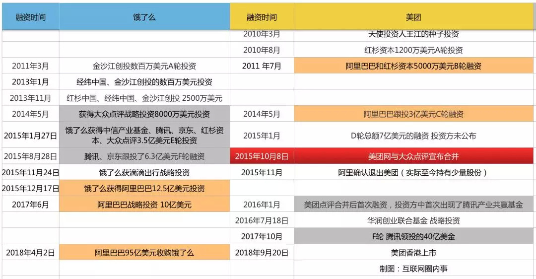 从饿了么和美团的融资历史来看,其实饿了么最初应该更偏向于腾讯系,而美团更偏向于阿里系。