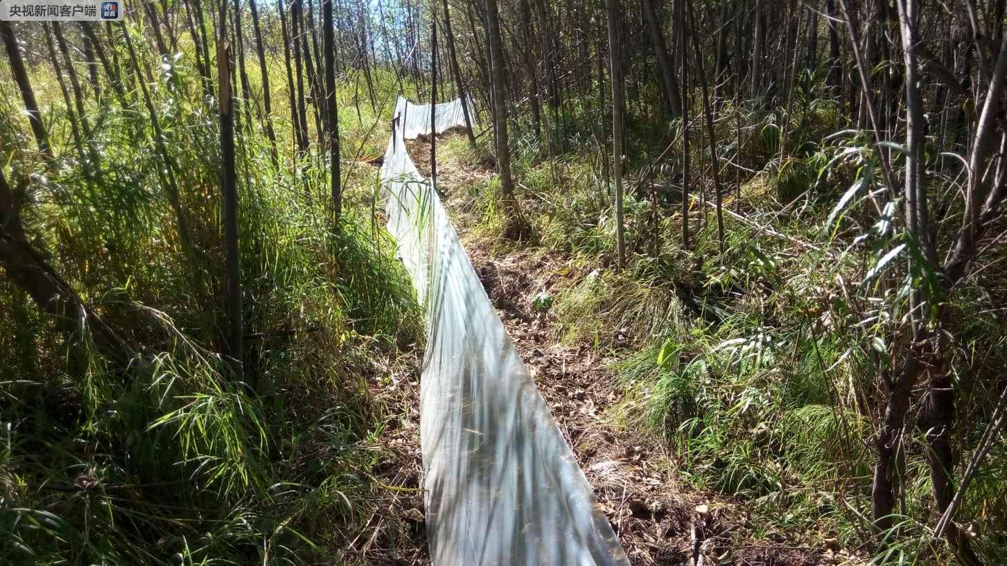 中国野生动物保护协会志愿者 于江春:右手边就是汤旺河,左手边就是这个山,山脚全部让这个(捕)林蛙的“旱亮子”包住了,山上下来的林蛙全都下不来了。