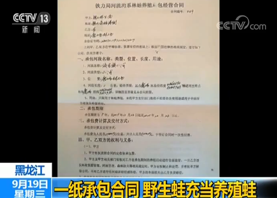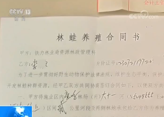 调查中记者还发现,目前伊春地区捕捉野生林蛙的人大都是林蛙养殖户,明知捕猎野生林蛙是违法行为为何还要这么干,据透露他们手中都有一份与当地林业局签订的养殖合同书。