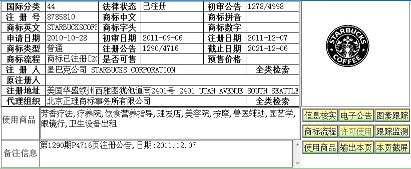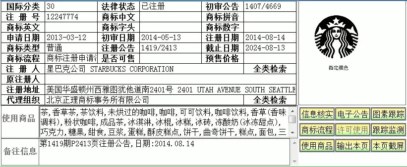 事实上,小知查询到,星巴克公司的人鱼LOGO早已成功注册,而且基本是全类别注册的那种。请看下图。