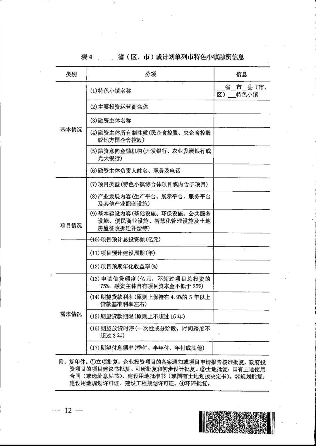 文件要求,2018年12月底前,省级发改委收集特色小镇信息(包括申请信贷额度、期望信贷利率、期望贷款期限、期望放贷时序、期望付息频率等),汇总印送省级开发银行、农业发展银行和光大银行,并会同省行将完成尽调小镇信息报送总行,抄送国家发改委。各总行开辟绿色通道,在2019年1月底完成评审和融资服务,将批复投放情况报送国家发展改革委。