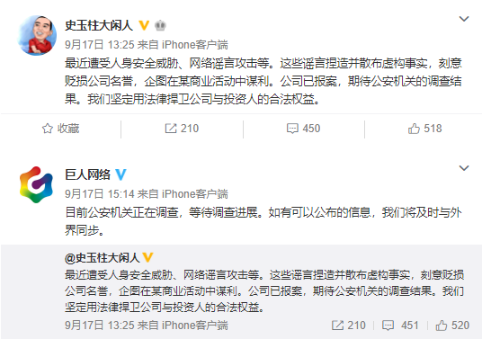 近日,史玉柱的微博发布了一条受人威胁信息,就在同一天,巨人网络转发此微博并表示公安机关正在调查,如有新的进展将会及时与外界同步。第二天,也就是9月18日,巨人网络发布公告,称巨人网络撤销收购Alpha Frontier Limited的收购全部A类普通股,其原因是收购时间较长,且有交易方提出解除原《资产购买协议》。